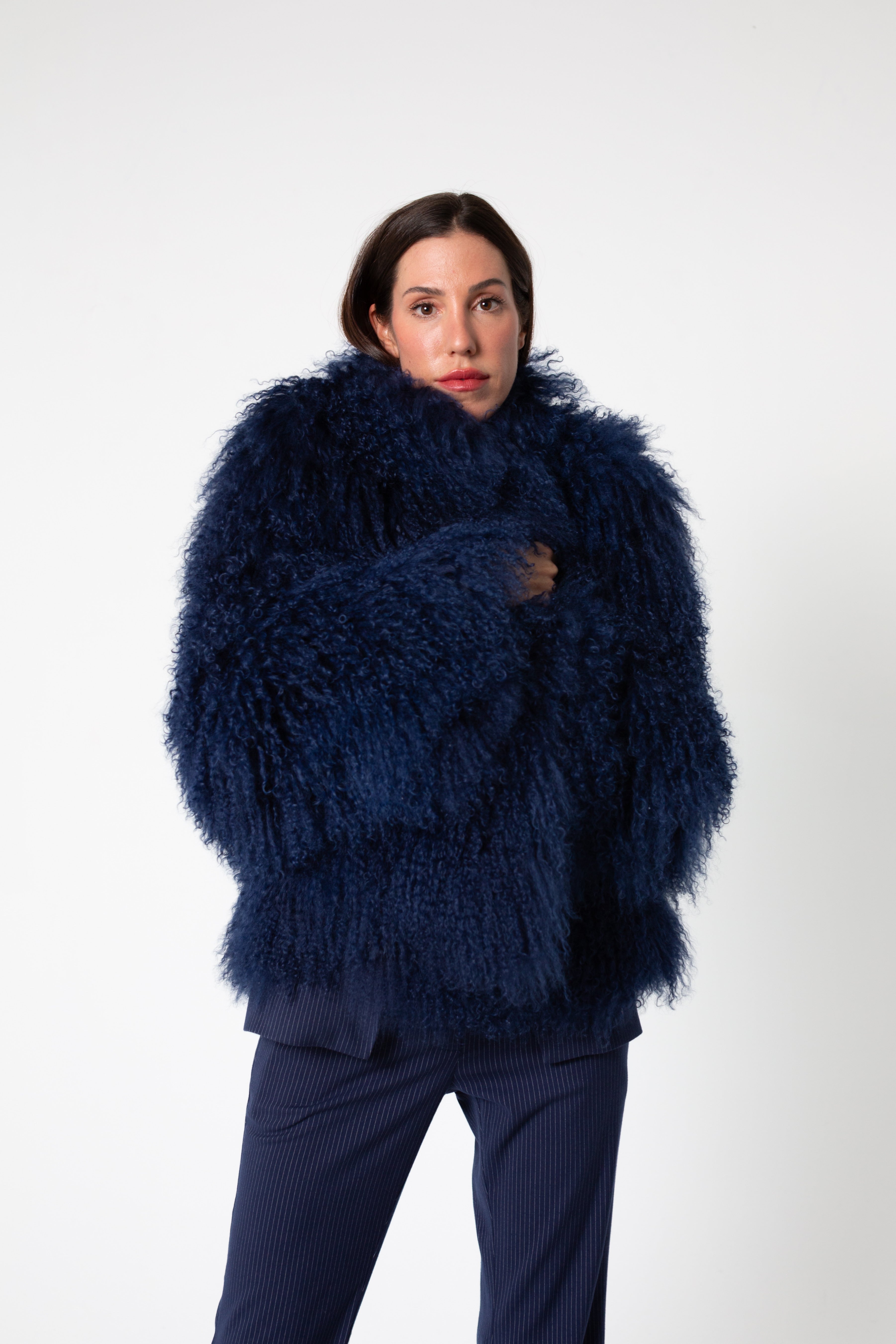 Una prenda de abrigo que es ya un clásico es nuestro abrigo de tibetlamb azul profundo. De largo a la cadera y con cuellos, es perfecto para los meses más fríos del invierno.