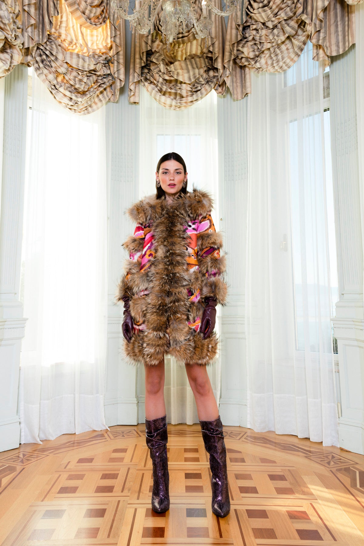 Abrigo terciopelo estampado ribeteado en pelo color natural