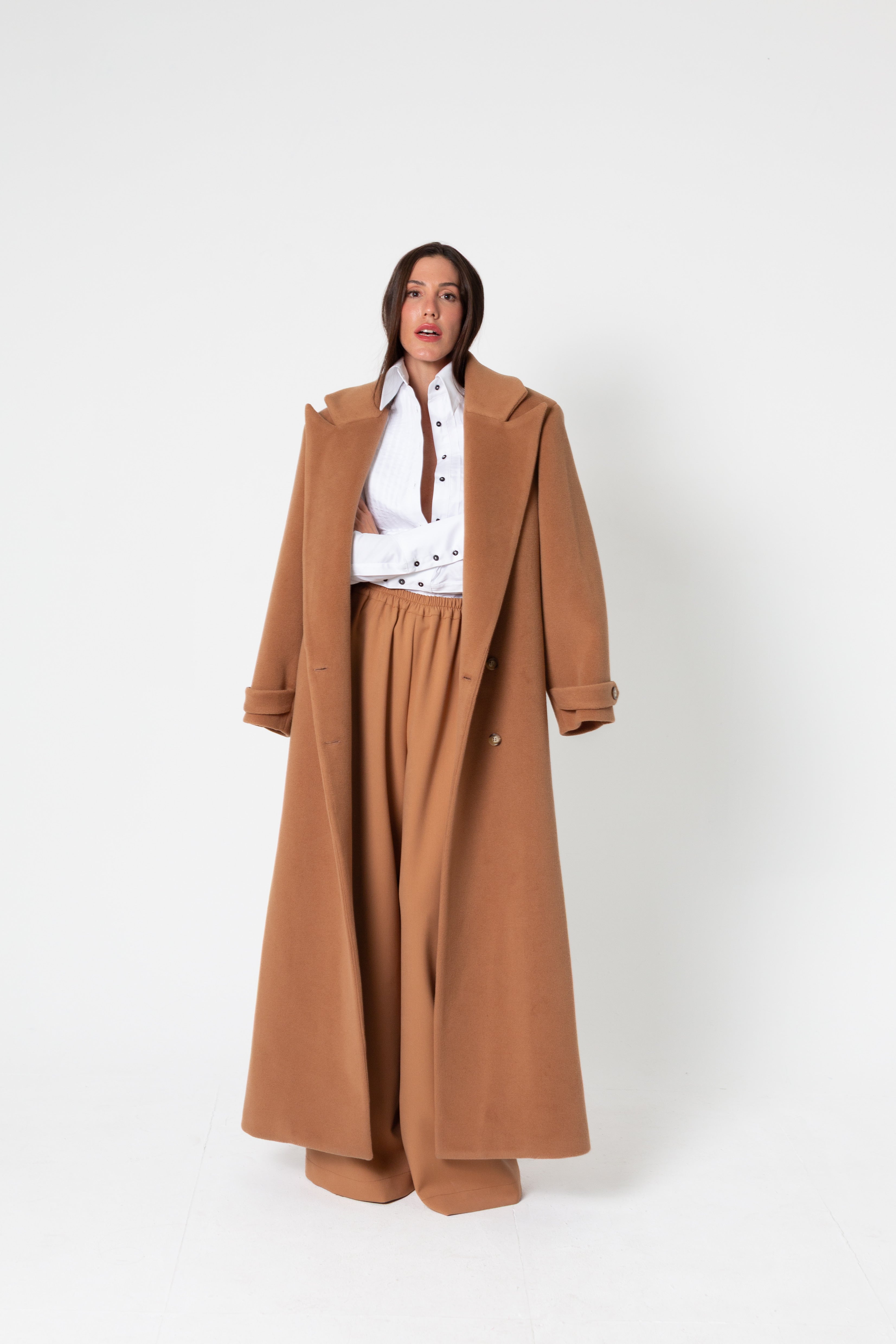 Abrigo de doble botonadura con solapas anchas y mangas con trabillas en puños. Tacto aterciopelado y forro rosa característico de la firma. Combina nuestro abrigo camel de corte clásico con nuestros pantalones a tono y cinturilla ajustable para un total look formal y transiciona hacia una noche con amigas combinándolo con nuestra mini falda de lentejuelas.