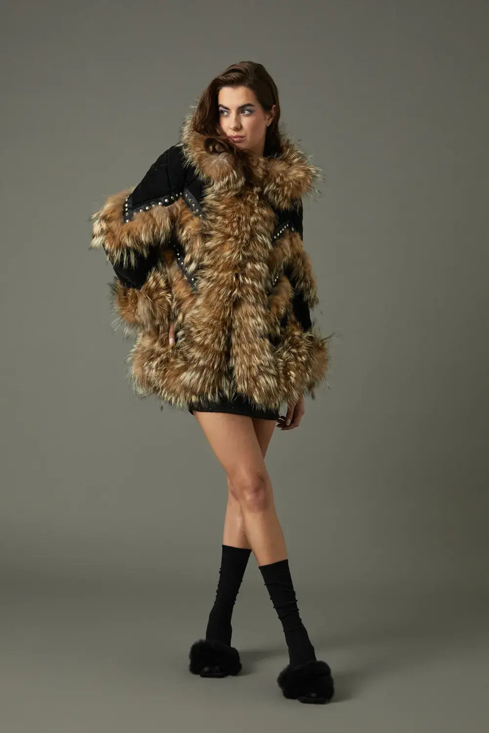 Abrigo terciopelo ribeteado y detalles en coyote con apliques en tachuelas