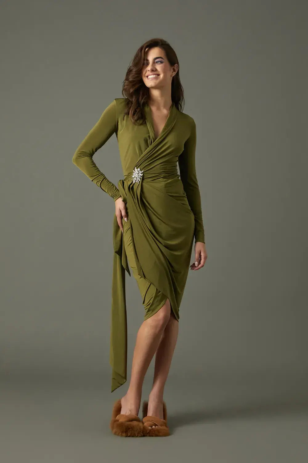 Vestido midi cruzado lazada estilo batín con detalle joya